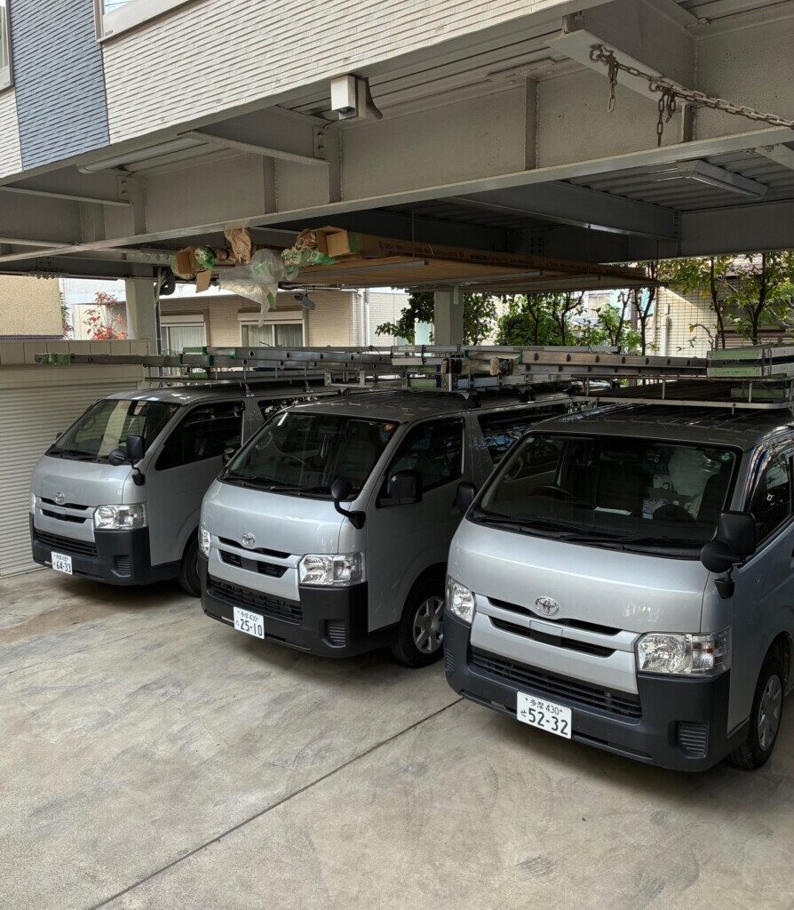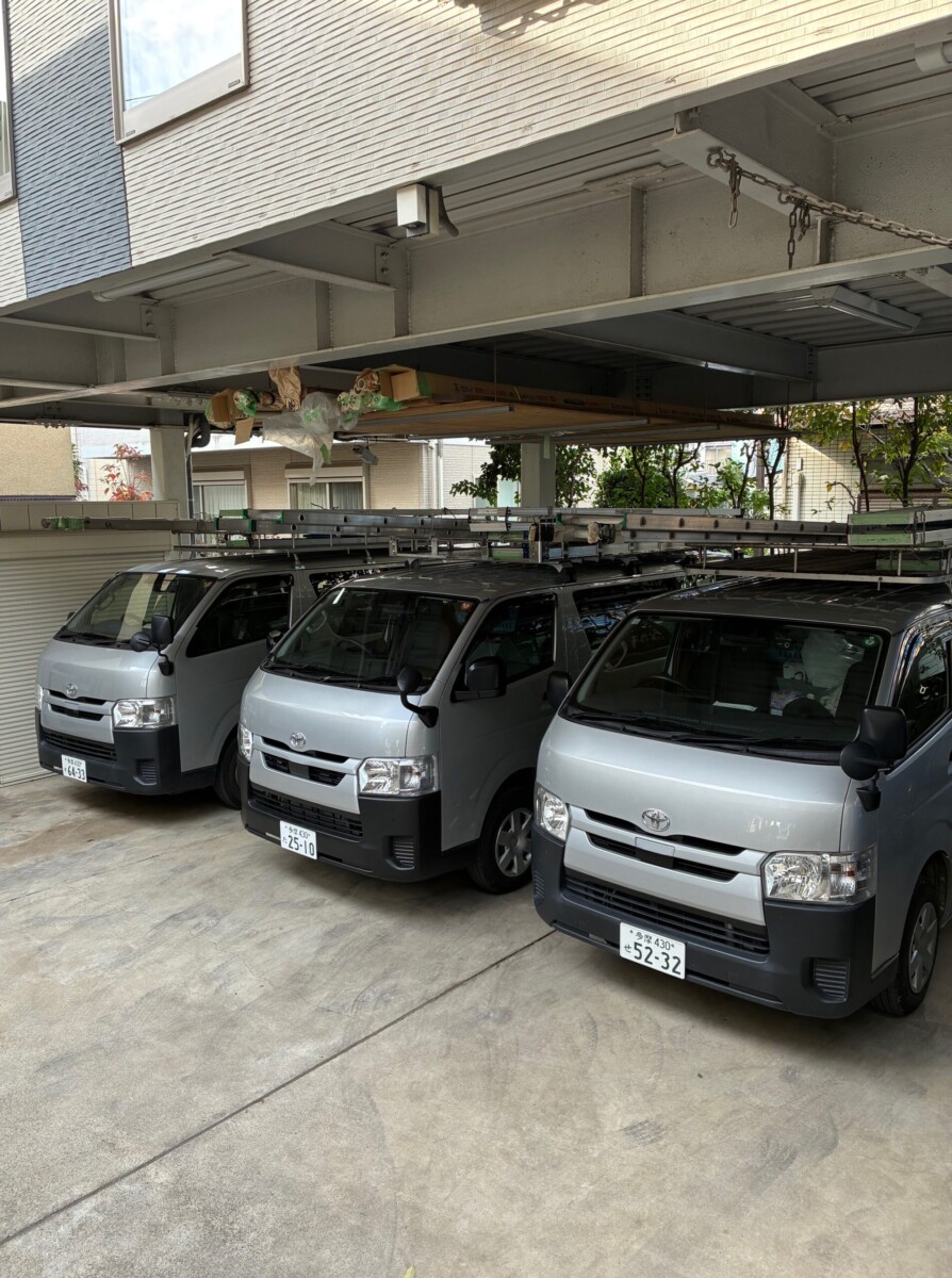 中央のハイエースが3号車です。これからはより迅速にかつ3か所同時に現場に向かえます!お仕事のご発注お待ちしております!!
